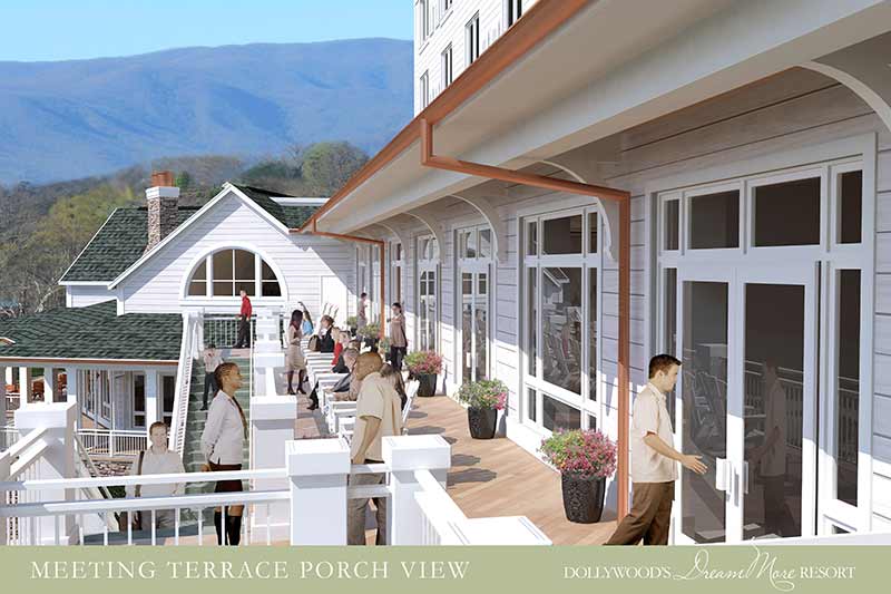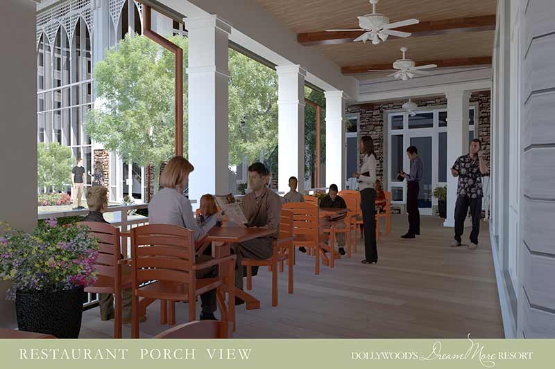 Dolly released the first conceptual renderings of Dollywood’s DreamMore Resort. The renderings showcase both the resort’s interior and exterior, which is reminiscent of a Southern-style front porch. Specific renderings included: