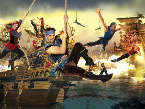 Excitement builds with another new acrobatic act featuring the ship mast. Pirate crews climb, slide down and pose on vertical poles as they prepare for their pirate feast. The skill and bravery of the pirates have you on the edge of your seat. With nets full of treasure, gold coins, fountains of water and thrilling pyrotechnics, Pirates Voyage new finale is like nothing you have seen before.